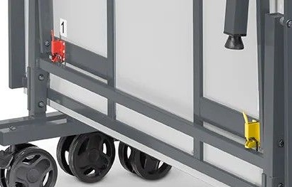 • Svaka polovica stola ima dva osigurača kod preklopljenog položaja i 4 dupla kotača širine 15 cm koji se mogu zaključati za dodatnu sigurnost tijekom transporta i skladištenja